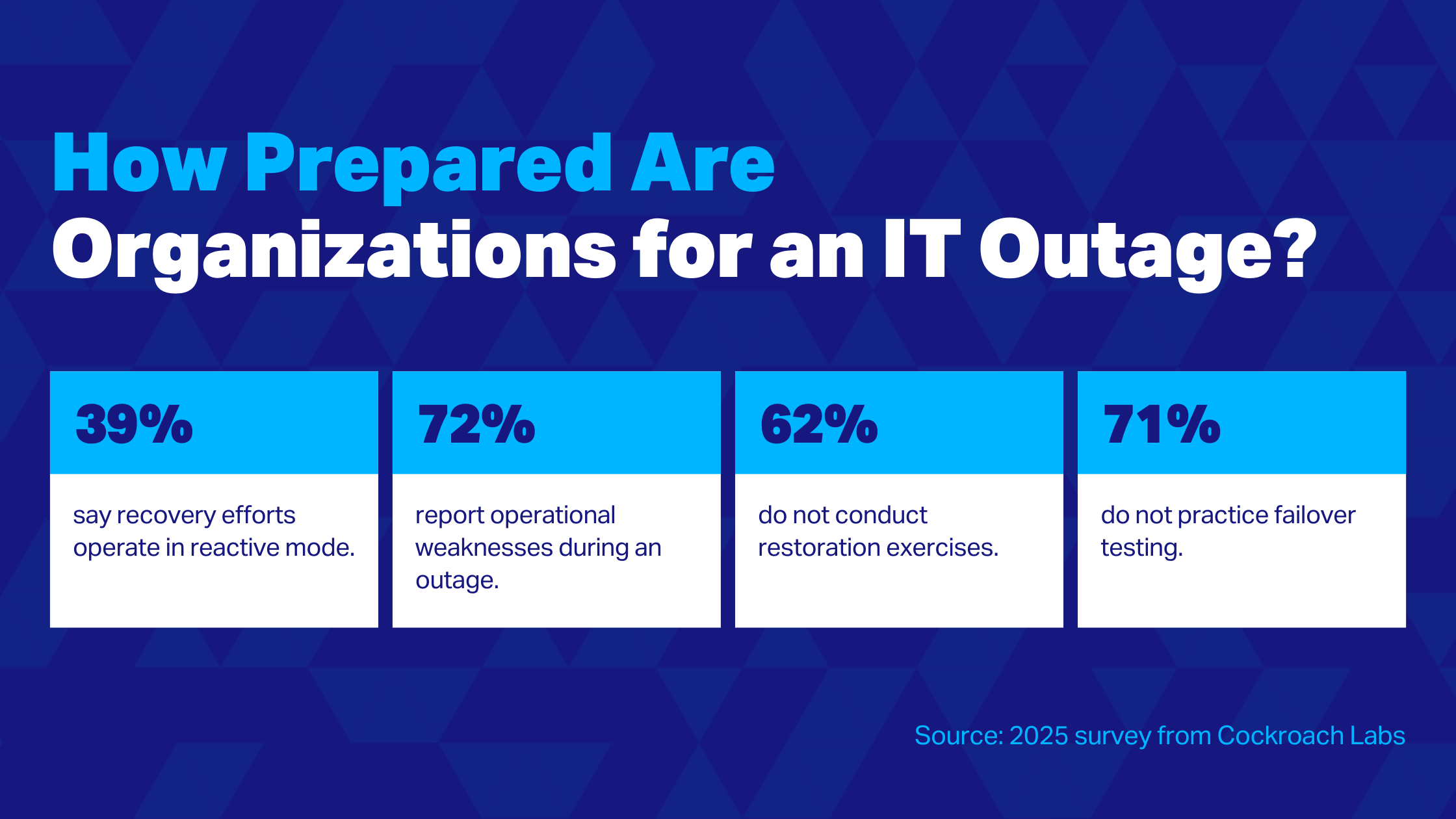 Others don’t have a playbook at all: 39% of executives told Cockroach Labs their recovery efforts are in full reactive mode. It’s not surprising, then, that nearly three-quarters (72%) say several operational weaknesses are holding them back from meeting both business and technical objectives during an outage. Without clear procedures, ownership isn’t well-defined, and repair can quickly become fragmented.
